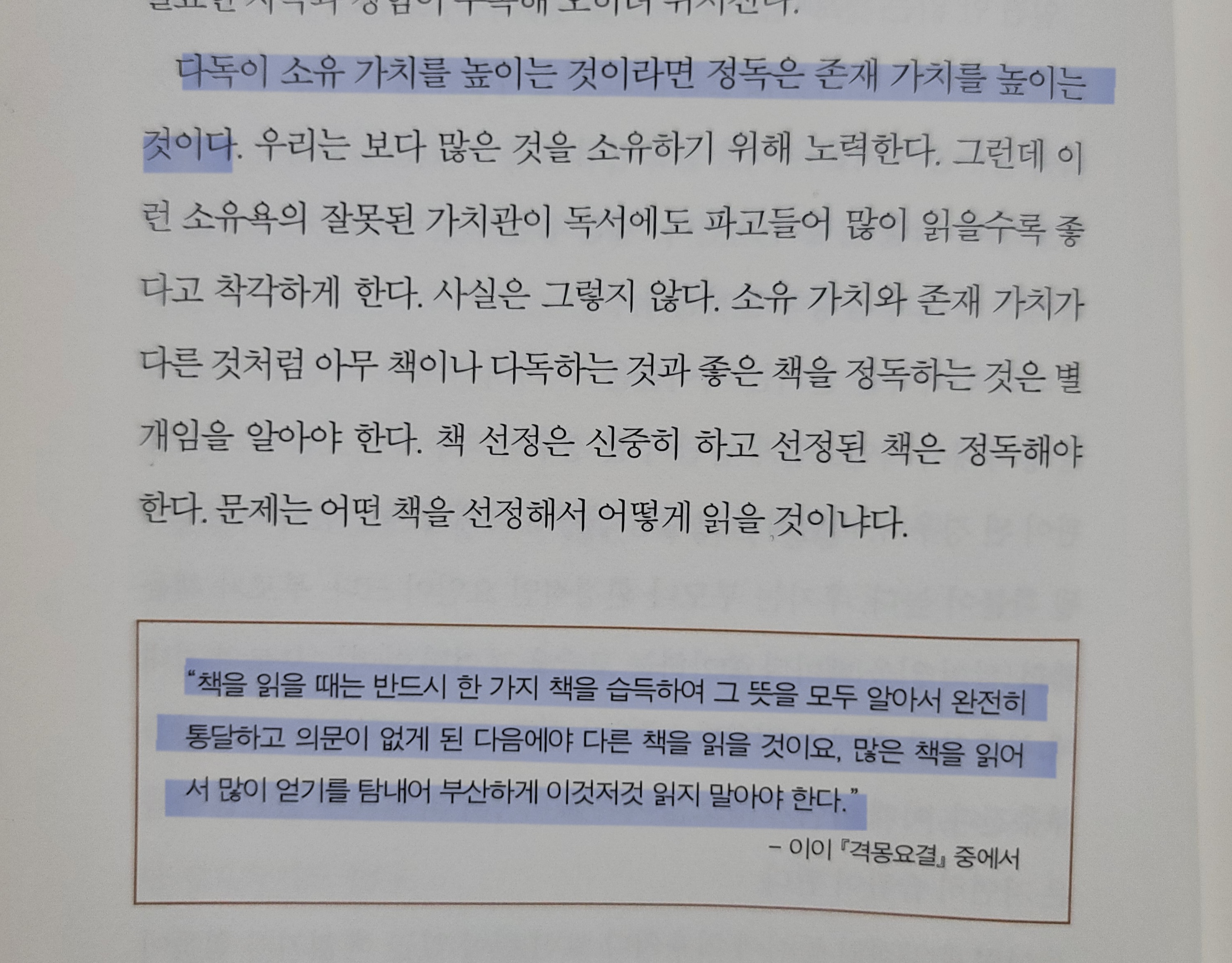"다독이 소유 가치를 높이는 것이라면 정독은 존재 가치를 높이는 것이다."