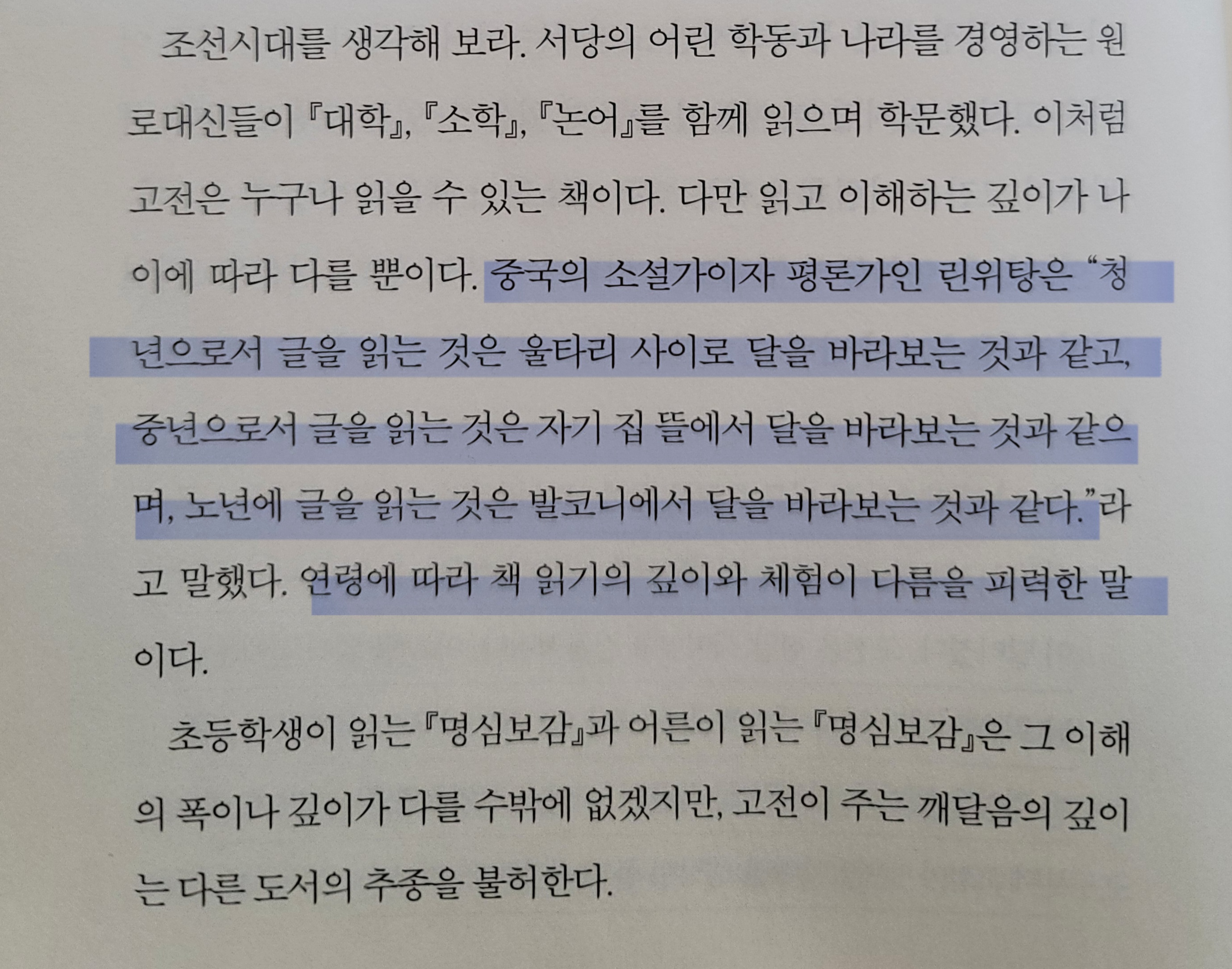 중년으로서 글을 읽는 것은 자기 집 뜰에서 달을 바라보는 것과 같으며,
